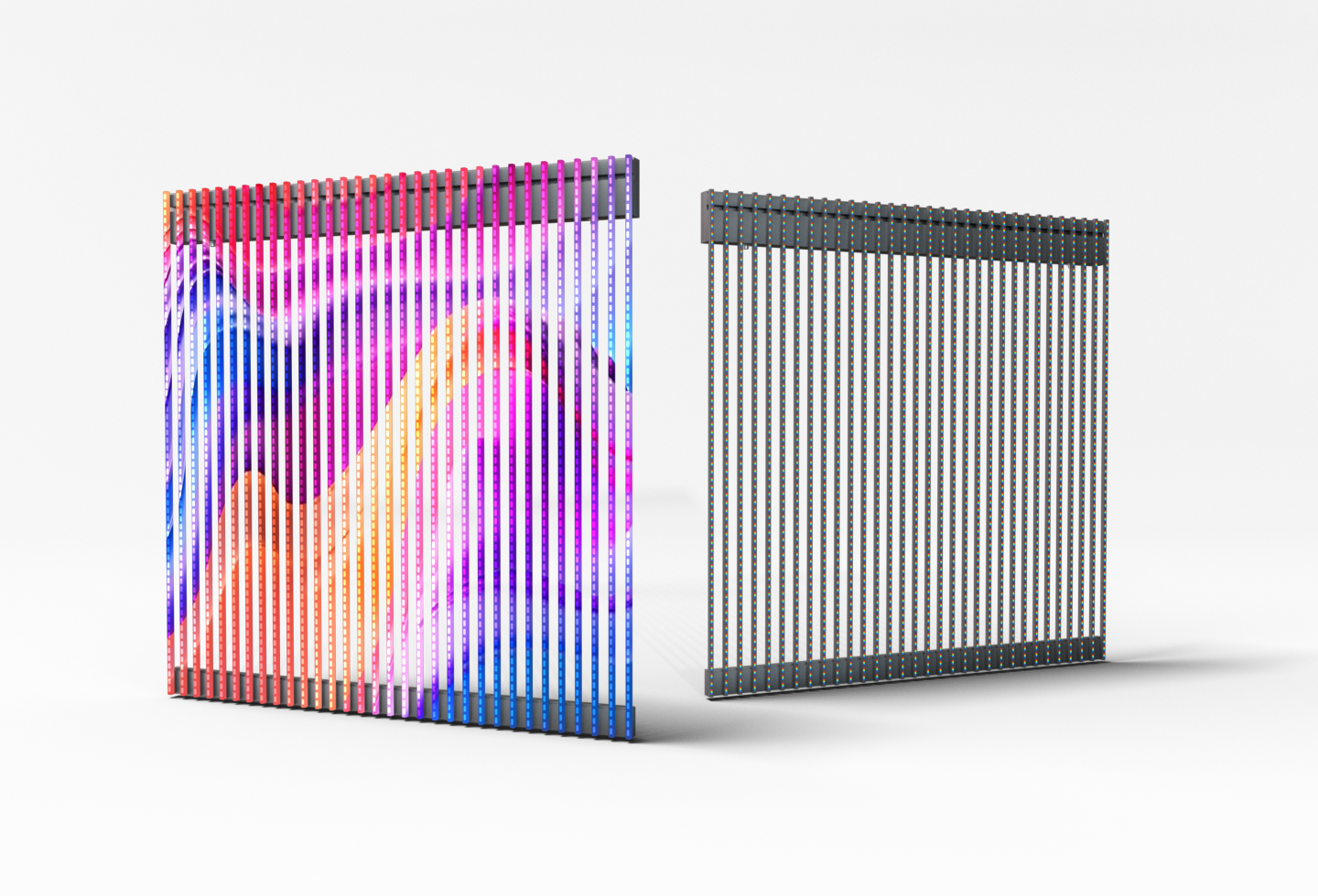 Реечный DIP и SMD медиафасад | Кабинет светодиодного медиафасада представляет собой каркас, на котором располагаются ламели (горизонтальные или вертикальные) со светодиодами. Существует 2 технологии монтажа светодиодов: SMD и DIP. Технология DIP шаги от 16 до 33. SMD шаги от 3.9 до 10.4. Устанавливается на металлический или алюминиевый каркас, закрепленный на стене здания. |